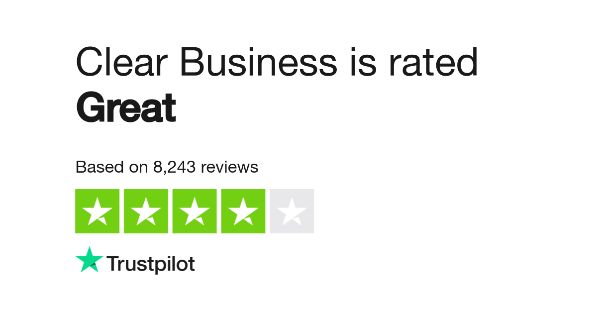 Over 70 of our Trustpilot reviews are rated Great or Excellent. Clear Business is by far the best company I could of ever signed up my services with I cant fault them on anything I always get the helping hand I require at all times and if any issues do pop up they are resolved as quick as they physically can. We are glad we could provide you a quote and look forward to the future.